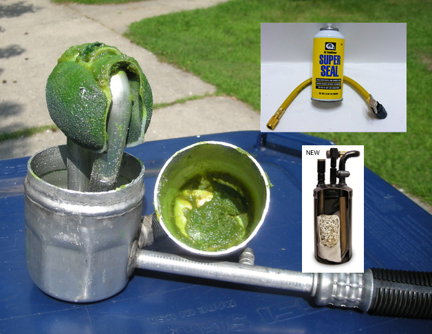 We do not react to moisture and therefore do not come in a sealed pressurized can that are dangerous they sometimes harden while you are trying to do the install.  Additionally, our SLP product will not clog installation equipment or the recycling machines needed to remove gasses from systems being serviced.  Take a look at this picture and you will see why the products in pressurized can are a nightmare for the AC System, they are likewise a problem for a recycling equipment.