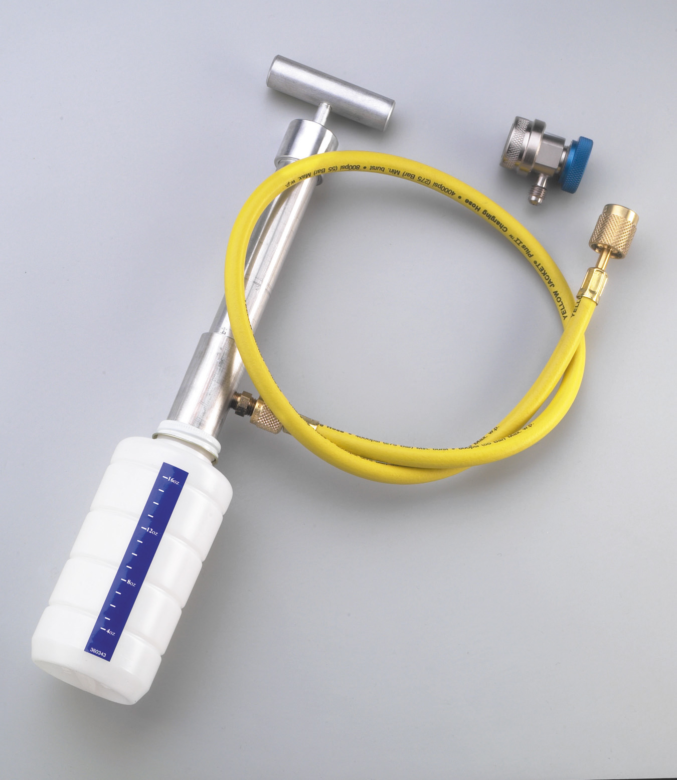 Our basic 2oz oil injector is placed inline with the low side hose, (after the gages),